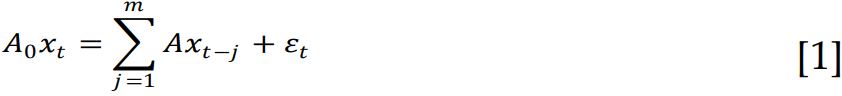 εt = es la parte no explicada del modelo que se incluye como un vector de variables aleatorias llamadas ruido blanco, las cuales toman los valores E [εt’, εs] = 0 si t ≠ s; y E [εt’, εs] = I si t = s.