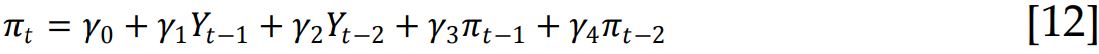 Donde k = 1 puede ser seleccionado de acuerdo con el criterio Akaike (AIC) o Schwarz (SIC) y dmax = 1, entonces, la hipótesis nula de no causalidad de Y a π es: H0:γ1=0. Esto es, H0: X no causa en el sentido de Granger a Y.