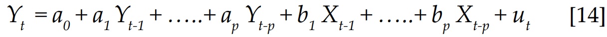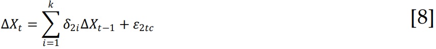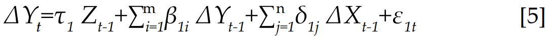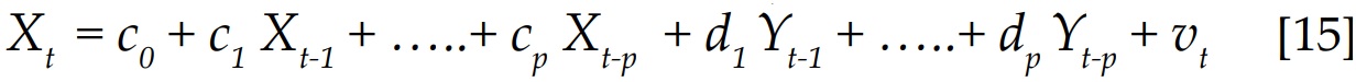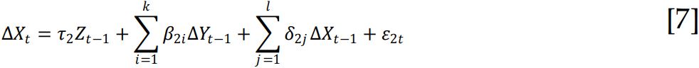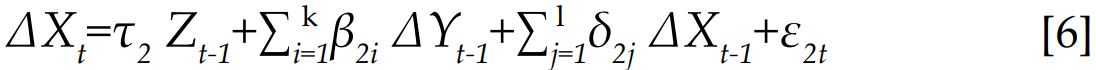 Zt-1 es el error de equilibrio, computado como el residuo de la ecuación de cointegración correspondiente. En tanto que la segunda ecuación está formulada sobre la hipótesis de que Y no es causa de X.
