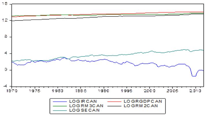 En la figura 1, con la finalidad de mostrar evidencia empírica de la relación existente entre el sector financiero y la economía real, se observa la dinámica de la evolución en el tiempo entre las variables canadienses. Como puede apreciarse las variables proxies tienden a moverse de manera conjunta, solamente las tasas de interés muestran una dinámica similar al mercado bursátil.
