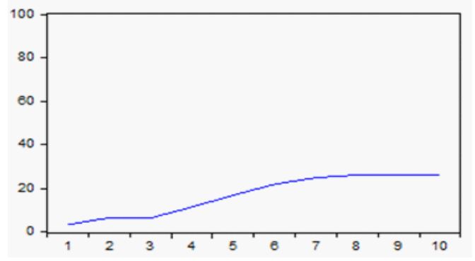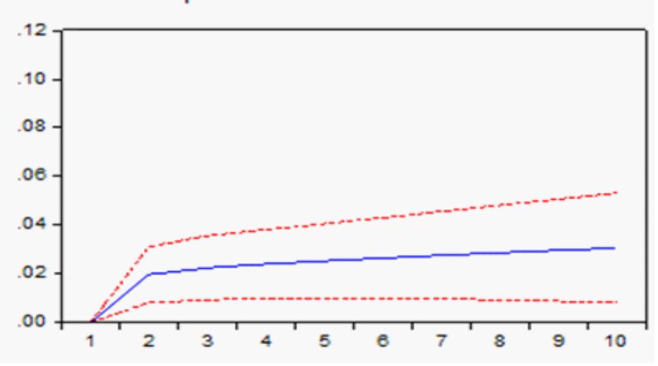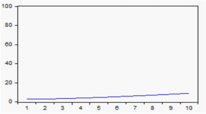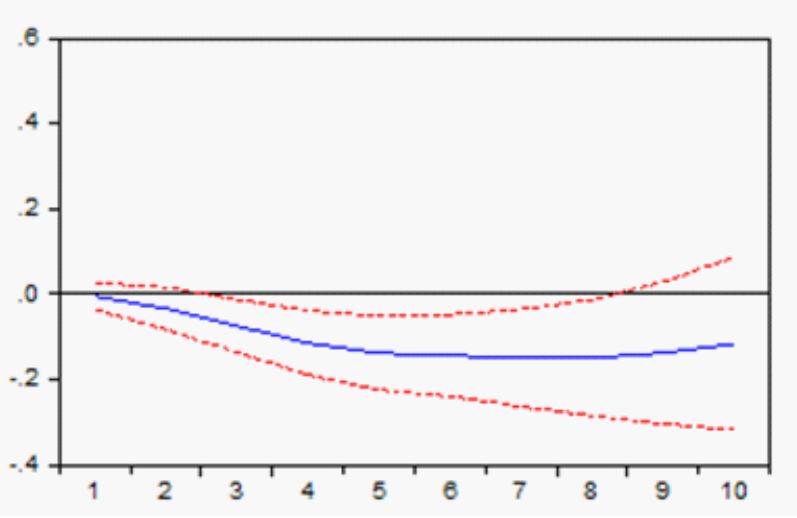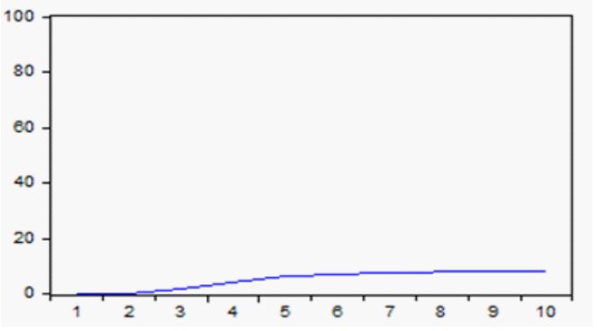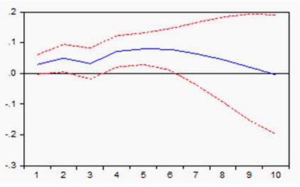 Por otra parte, el efecto de la Bolsa de Valores de Estados Unidos, como se advierte en la figura 5, es nulo en el primer periodo, incluso durante los siete periodos subsecuentes va acumulando sus efectos hasta añadir 0,03 al cabo de 10 periodos.