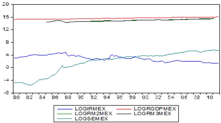 Para el caso de México, como se muestra en la figura 2, sucede algo diferente que en el caso del mercado canadiense. Las variables que reflejan la dinámica de la economía real parecen moverse de manera conjunta; excluyendo de este comportamiento a las tasas de interés y el desempeño del mercado de valores. Permitiendo inferir la inexistencia de alguna relación de largo plazo entre estas variables.