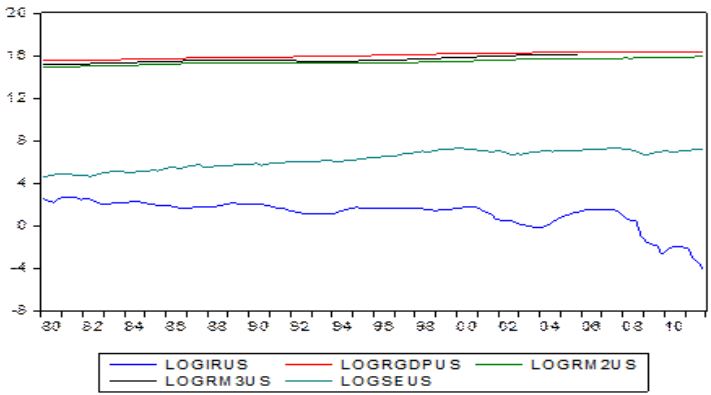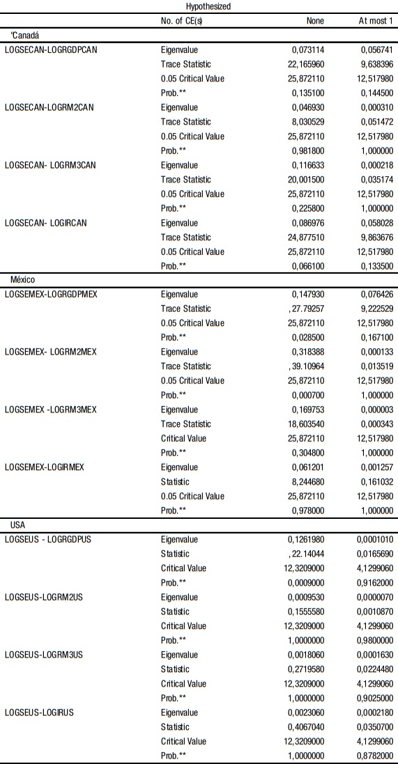 El cuadro 6 presenta los resultados de la prueba de la traza contemplando los elementos determinísticos respectivos de los procesos generadores de esos datos, confirmado la presencia de vectores cointegrantes solo entre tres pares de las variables en cuestión: LOGSEMEX-LOGRGDPMEX, LOGSEMEX-LOGRM- 2MEX y LOGSEUS–LOGRGDPUS.