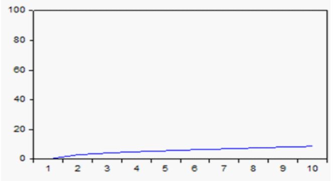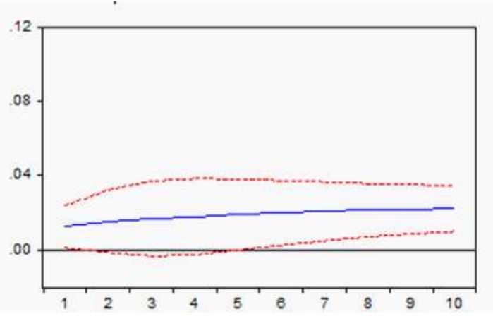 En tanto que para el caso de M3, en la figura 7 se puede notar un incremento equivalente a 0,029595 en el periodo inicial aumentando a 0,080696 después de 5 periodos. A partir del sexto periodo los efectos tienden a decrecer lentamente hasta convertirse en negativos en el periodo 10.