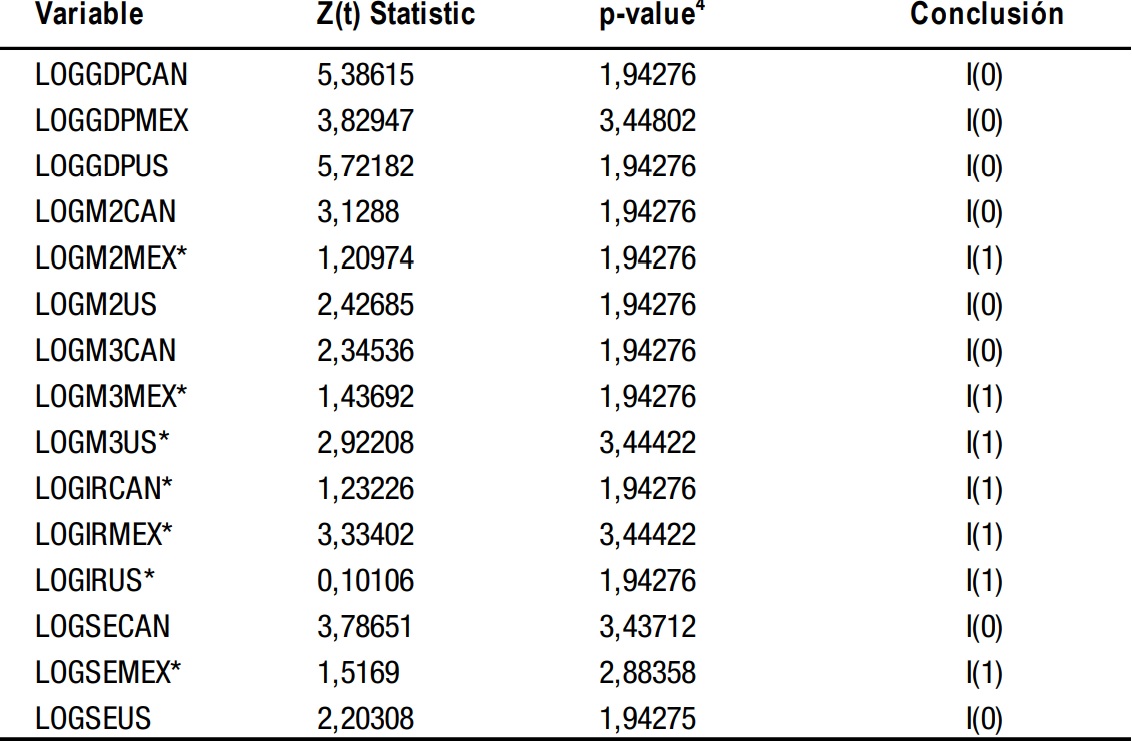 Los datos tienen una frecuencia trimestral para el horizonte temporal comprendido entre 1970 a 2011. Las series canadiense y estadounidense comprenden un total de 168 observaciones cada una de ellas. En el caso de México, la muestra se acorta por la disponibilidad de la información. El conjunto de series económicas y financieras se obtuvieron de la base de datos International Financial Statistics (IFS) del Fondo Monetario Internacional. Para determinar las relaciones causales se emplearon dos procedimientos: el modelo de Granger (1988) y la metodología extendida para la prueba de no causalidad de Granger de Toda y Yamamoto (1995).