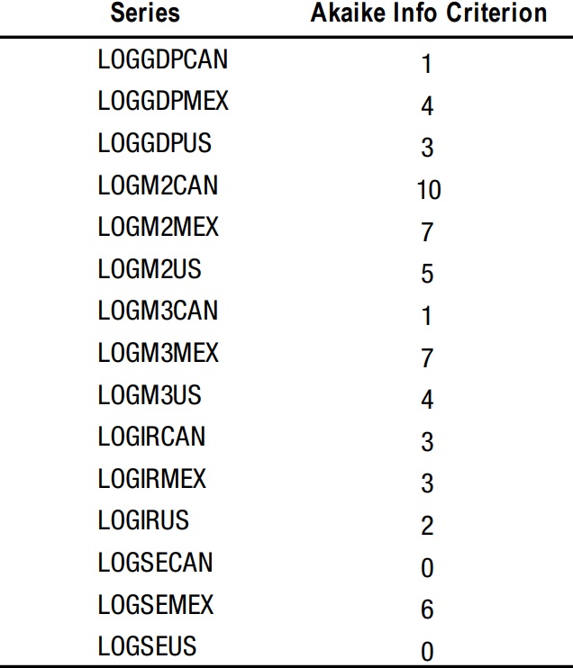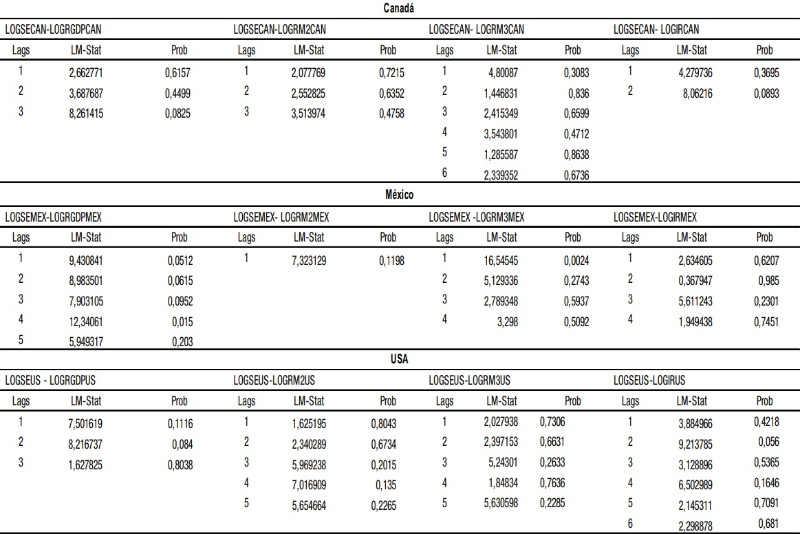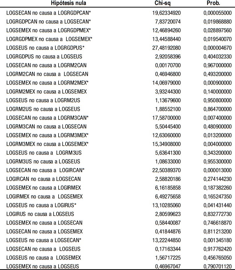 Es de resaltar que, a pesar de encontrarse vectores cointegrantes en la prueba de la traza previamente realizada entre tres pares de las variables en cuestión: LOGSEMEX-LOGRGDPMEX, LOGSEMEX-LOGRM2MEX y LOGSEUS–LOGRGDPUS, no se confirmaron las relaciones de causalidad en los casos de M2 para México y el PIB para Estados Unidos.