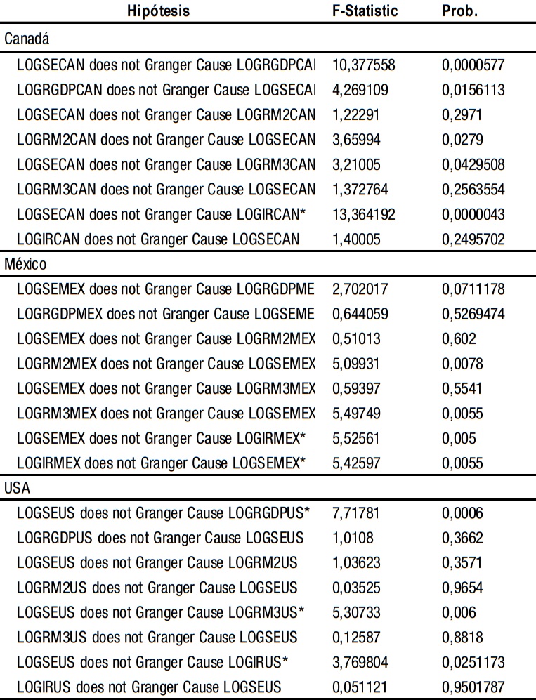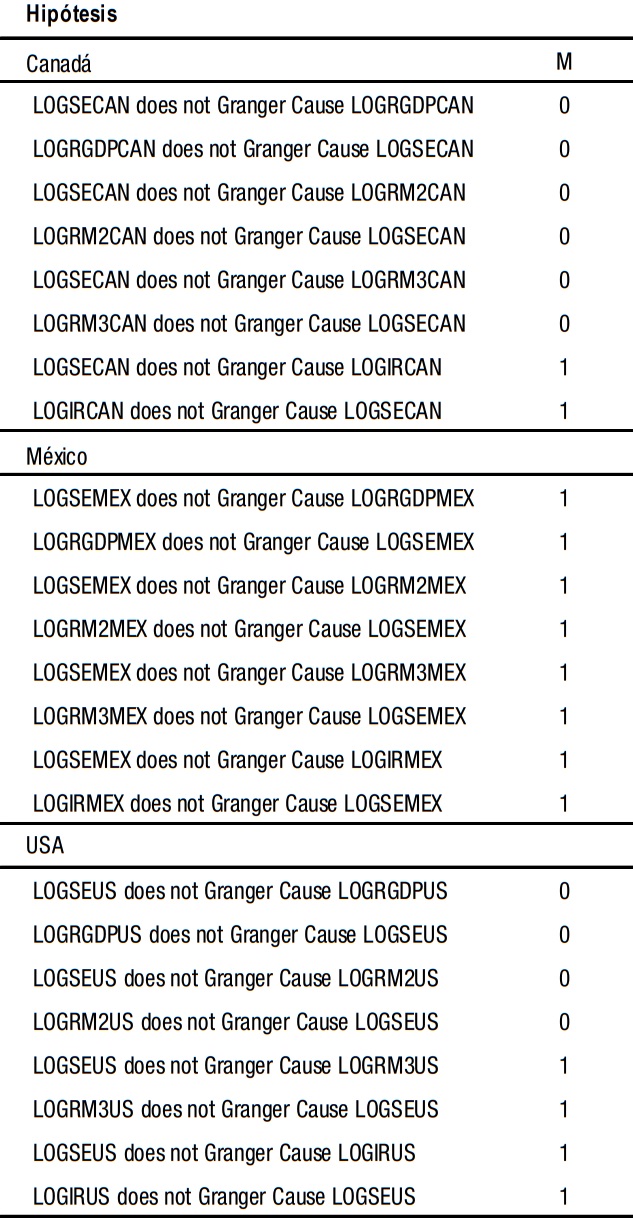 Los resultados obtenidos acerca del desarrollo financiero y el crecimiento económico en los tres países de América del Norte mostraron evidencia sobre la direccionalidad de la causalidad entre ellos, que será descrita a continuación. Para el caso del mercado accionario estadounidense, con base en estas pruebas, se puede afirmar que la dinámica de la economía local y de los otros dos países no causa, en el sentido de Granger, a la dinámica financiera norteamericana. En tanto que para Canadá, se encontró evidencia de que la economía de ese país, medida por el PIB, causa en el sentido de Granger al mercado accionario canadiense. También los resultados obtenidos para este país, pusieron de manifiesto la nula influencia que tiene este mercado proveniente de la dinámica económica y financiera de los otros países objeto de estudio. De igual forma, se comprobó que el crecimiento económico de México, medido a partir del PIB y M3, causa en el sentido de Granger al mercado bursátil de este país. El desarrollo financiero mexicano no tiene influencia del crecimiento económico presentado en los otros dos países del bloque comercial.