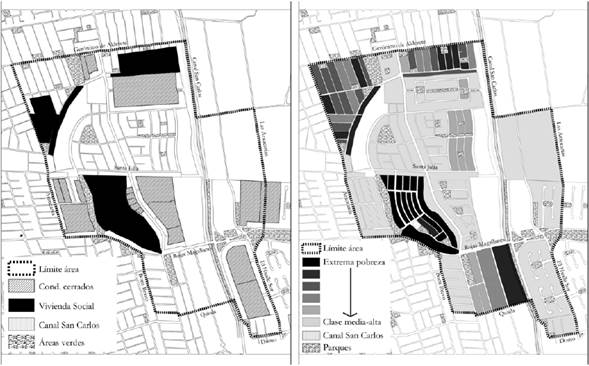 Se eligió un caso de estudio en la comuna de La Florida (Santiago), por ser esta de alguna manera "un espejo de Chile" (De la Jara, 2003), en términos de sus recientes transformaciones sociales, culturales, económicas y urbanas. La comuna creció fragmentada entre un sector surponiente que recibió la gran mayoría de las viviendas sociales, y un sector oriente, anteriormente semirrural, que recibió las villas de sectores medios. Su configuración actual, entonces, es de fuertes contradicciones entre los grandes proyectos inmobiliarios (comerciales, habitacionales, educacionales, de salud, etcétera), y la pobreza y los déficit de equipamiento urbano. Como intersección de estos dos mundos, se eligió el área alrededor de La Loma. La figura 1 muestra, a la izquierda, los límites del área escogida y la localización de viviendas sociales y condominios cerrados; y a la derecha, la distribución socioeconómica de la población.