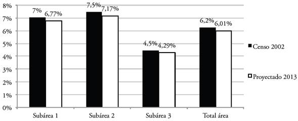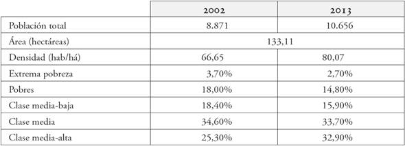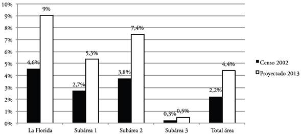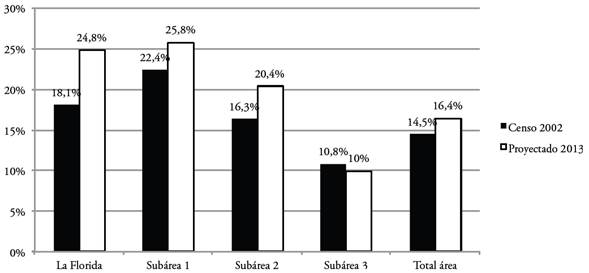 El censo 2012 tuvo varios problemas en la obtención y tratamiento de los datos (ej. alto nivel de imputación), y finalmente se recomendó repetirlo en 2017. Por tanto, los datos de dicho censo perdieron credibilidad y el acceso a la información quedó deshabilitado. Dadas estas limitantes, se elaboró una estimación de la población del área de estudio para el año 2013 de la siguiente manera. Primero, solo se midió el cambio socioeconómico y demográfico del área a partir de nuevas manzanas y nuevos conjuntos habitacionales construidos. Se asumió, entonces, que el número de predios es igual al número de hogares, y que en las manzanas que se mantienen de 2002 a 2013, la distribución de grupos socioeconómicos y la población es la misma que en 2002. Segundo, se trabajó sobre la base de la cartografía y censo 2002, detallando grupos socioeconómicos por manzana: ABC1, C2, C3, D y E (metodología de marketing)3 Tercero, se elaboró un plano actualizado según Plan Regulador de La Florida, Google Earth y observaciones en terreno. Cuarto, se contó el número de predios por manzana, según plano actualizado, obteniendo así el número actual de hogares (tras las nuevas construcciones después de 2002). Quinto, se utilizó un tamaño promedio de hogar según grupo socioeconómico (por deciles de ingreso, según Instituto Nacional de Estadísticas, INE). Sexto, según observaciones en terreno, se imputó la distribución porcentual de grupos socioeconómicos para las manzanas nuevas, desde otras manzanas similares. Y séptimo, para obtener la población total por manzana, se dividió el número total de hogares por la sumatoria de los cocientes entre el porcentaje de población por grupo socioeconómico y el tamaño de hogar por grupo. Para las proyecciones de las figuras 3, 4 y 5 se utilizó el censo 2002 como base, y con el número de viviendas del pre-censo 2011 y las encuestas CASEN (véase sección 5, abajo) de los años 2000 y 2009, se extrapolaron los datos del censo 2002.