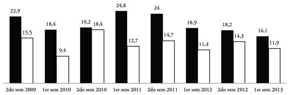 Otro de los temas destacados por la literatura existente (Salcedo & Torres, 2004) se refiere a los beneficios que acarrea en los barrios socialmente diversos, el hecho de tener clientes de mayor poder adquisitivo para los comercios de baja escala (en las propias viviendas sociales). Pero este argumento también está mediado por varios matices. Primero, en la gran mayoría de los barrios pobres se puede encontrar este tipo de establecimientos (a juicio de los entrevistados), por lo que esto no es una característica única de barrios socialmente diversos. Segundo, varios habitantes de clase media tienen locales comerciales en sus propias casas. Por ejemplo, en la calle Jardín Alto, en un espacio de tres cuadras (entre Rojas Magallanes y Santa Julia), hay cinco locales comerciales en viviendas que califican para el 10% más rico de la población. En otras palabras, el comercio de pequeña escala no es patrimonio de la clase baja. Y tercero, muchos habitantes de clase media prefieren no entrar a los espacios de clase baja (lo cual se verá más adelante), por lo que el beneficio económico de la diversidad social no es tan elevado. En general, los niveles de empleo para la clase baja del barrio son bastantes altos, pero esto se relaciona más con el momento económico que vive Chile que con la cercanía a habitantes de mayores ingresos. Muchos entrevistados reconocen que "a nadie le falta pega", pero a la vez reclaman por los bajos sueldos y la precariedad laboral, que ha sido el rasgo más característico de la generación de empleo en los últimos años. Además, el empleo para los jóvenes es de baja calidad y entrega pocas perspectivas de movilidad social, por lo que algunos deciden insertarse en el tráfico de drogas. Las figuras 3, 4 y 5, abajo, muestran la variación del desempleo, el trabajo doméstico y el trabajo por cuenta propia, respectivamente. Tal como se puede observar, los cambios observados responden más a tendencias generales1 del Gran Santiago que a una especificidad del barrio.