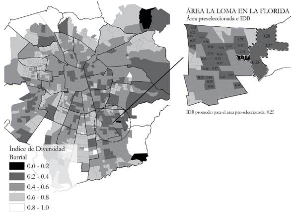 El área alrededor de La Loma en La Florida se seleccionó por su representatividad como caso extremo de diversidad socioeconómica en el Gran Santiago. Para medir la diversidad socioeconómica, se creó el Índice de Diversidad Barrial (IDB):