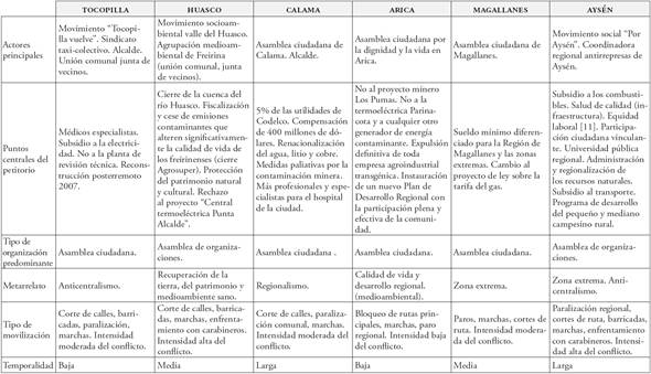 A su vez, en gran parte de los conflictos se observa la presencia de temáticas ambientales (Aysén, Arica, Copiapó), en torno a las cuales las redes trasnacionales o nacionales de defensa han creado estructuras sociales de deliberación ciudadana.