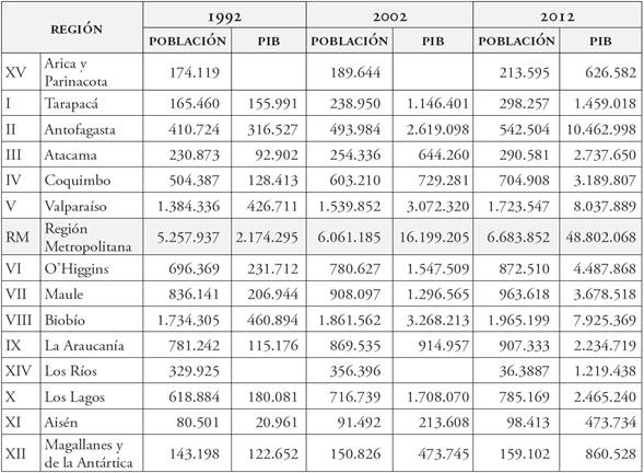 En la tabla 1 podemos observar que la Región Metropolitana incrementó su población en 1 millón de personas aproximadamente en la década de 1992 a 2002, y entre 600.000 y 700.000 personas en la década de 2002 a 2012. Sin embargo, el PiB aumentó exponencialmente, pasando de los 2.174.295 millones en 1992, a los 16.199.205 en 2002 y finalmente a 48.802.068 en el año 2012. Ello demuestra la alta concentración del PlB en la Región Metropolitana, que claramente no está en relación con el aumento de su población.