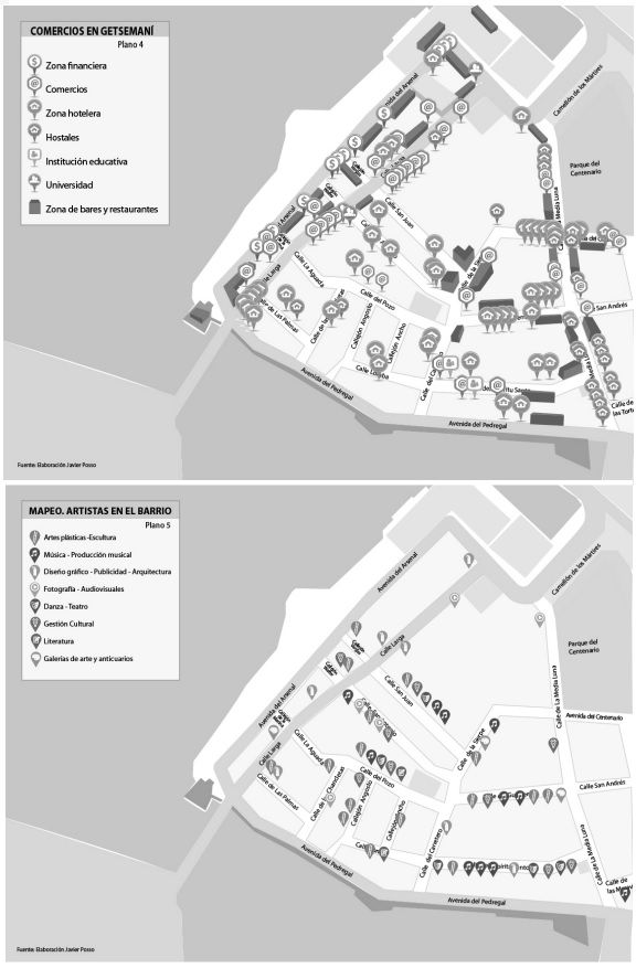 La figura 8 muestra un barrio en el que han surgido numerosos agentes nuevos respecto al estadio anterior al proceso de regeneración urbana, de iniciativa de inversores privados, y que tiene como marco normativo el Plan de Ordenamiento Territorial (POT) de la ciudad. Puede observarse, así, la presencia de agentes de la esfera económica ligados a la propiedad inmobiliaria, empresas turísticas, culturales o creativas (ocio, artesanías, pintura, etcétera); o bien nuevos comercios, que en diversos modos y grados han contribuido al proceso de gentrificación, no obstante que algunas organizaciones intentan combinar el desarrollo económico y turístico con la permanencia de la población local.