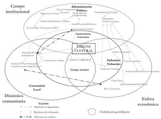 Debe destacarse también que, desde hace dos décadas, la Fundación Gimaní Cultural ejerce de elemento dinamizador y aglutinador de la identidad del barrio y es pieza esencial en la organización del Cabildo de Getsemaní, manifestación festiva y cultural central para el barrio. Paralelamente a la organización institucional, y de otros agentes clásicos de la organización de la comunidad local, han surgido actores como Orgullosamente Getsemanicenses y Por ti Getsemaní, que reivindican la identidad tradicional y la continuidad de los antiguos vecinos, oponiéndose al proceso de gentrificación. Sin embargo, estos sectores tradicionales no han establecido complicidades sólidas con el sector cultural alternativo, como el centro cultural autogestionado Ciudad Móvil. Así, se advierten enfrentamientos internos en los liderazgos de la comunidad local, al igual que una falta de consenso con los nuevos habitantes relacionados con actividades creativas. Esta falta de cohesión interna resquebraja las posibilidades de alianzas antigentrificación. Todo ello se produce en planes de desarrollo del barrio impulsados por las administraciones públicas bajo un prisma gentrificador, que favorecen claramente los intereses privados del sector turístico y empresarial.