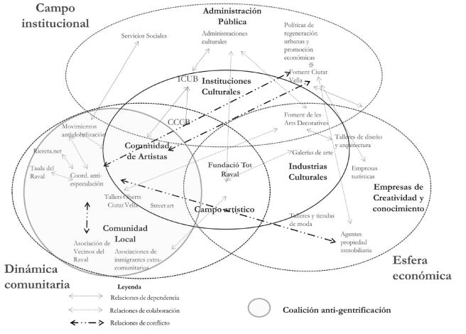 El Ayuntamiento de Barcelona, consciente de la complejidad para gobernar este entramado de dinámicas de clusterización cultural, decidió crear en 2002 la Fundación Tot Raval, que pretende crear un marco estable de interacción y colaboración entre los agentes de los tres ámbitos sociales. Este marco, sin embargo, no es neutral, y Tot Raval se enfoca a convertirse en una coalición de todos los agentes a favor de la regeneración urbana (y de sus consecuencias socioeconómicas), que ejerza el rol de dinamización social y tienda puentes entre las grandes instituciones culturales y la comunidad local (Truñó, 2008). Frente a esto, los agentes más críticos con el proceso de transformación urbana consideraron que Tot Raval estaba orientada fundamentalmente a la promoción económica y que su vertiente social no era más que una fachada legitimadora, por lo que decidieron boicotearla. Así, asociaciones de artistas y espacios culturales (Conservas, Almazen, Estudio 08001), grupos de activistas (antiglobalización, antiespeculación, tecnoactivismo), asociaciones vecinales no vinculadas con el Ayuntamiento (Taula del Raval) y en parte las instituciones culturales (MACBA), han forjado coaliciones antigentrificación.