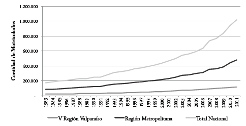 Paralelamente a este programa, el programa Estudia en Valparaíso, creado a fines de la década del 2000, complementa la estrategia regeneradora del PRDUV. Tiene por objetivo atraer estudiantes nacionales y extranjeros para que cursen sus estudios superiores en la zona, para lo cual promociona la calidad de vida de la región, su oferta cultural y de ocio junto a la calidad de la oferta académica. Se trata de un programa público-privado gestionado por la Agencia Regional de Desarrollo Productivo de la Región de Valparaíso, entidad que a su vez trabaja en colaboración con las instituciones de educación superior localizadas en el eje Valparaíso-Viña del Mar. La estrategia de renovación urbana y dinamización económica vinculada a la revalorización del patrimonio arquitectónico y el turismo se complementa así con la atracción de residentes jóvenes por razones de estudio, en un contexto de expansión de la oferta de educación superior a nivel nacional (Brunner, 2009). Con un crecimiento sostenido desde el año 1983, en un período de diez años, entre 2001 y 2011, se produjo un incremento aproximado de 60.000 estudiantes en la región, lo que representa un doblaje del número de estudiantes2 (figura 1). Si bien son datos a escala regional, se debe considerar que los centros universitarios se localizan casi en su totalidad dentro de la conurbación Valparaíso-Viña del Mar.