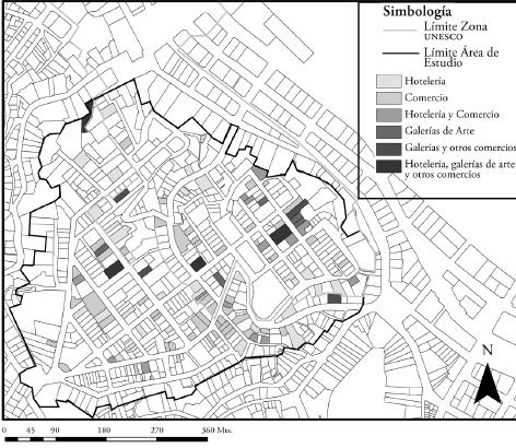 La localización de los nuevos comercios y el equipamiento hotelero han tendido a concentrarse tanto dentro de los límites de la zona declarada Patrimonio de la Humanidad como en su entorno próximo e inmediato (figura 3). Más allá de los límites establecidos por la denominación patrimonial, es dentro de los límites naturales de los cerros Alegre y Concepción donde los cambios han sido manifies