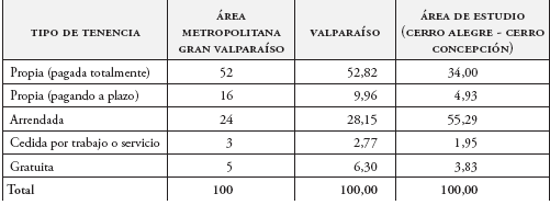 El análisis de los datos del Censo de Población y Vivienda 2002 revela que el régimen de tenencia de las propiedades en los cerros Alegre y Concepción (zona Unesco) ha tendido a agilizar la transformación de la zona, dada su condición dominada por la tenencia en alquiler. Si bien la ciudad de Valparaíso y su área metropolitana tienen alrededor del 52% de la vivienda en régimen de propiedad pagada, este porcentaje cae al 34% en el caso del área Unesco. A ello hay que añadir que el régimen de tenencia en propiedad, pero con hipoteca, también es más elevado en el área metropolitana (16%) y para la totalidad de la ciudad de Valparaíso (prácticamente un 10%), que para la zona Unesco (4,9%). Aunque no se puede afirmar que los arrendatarios constituyan un grupo social caracterizado por mayor vulnerabilidad ante las nuevas dinámicas de reestructuración espacial, el mayor porcentaje de viviendas en condición de alquiler en los cerros Alegre y Concepción aumenta la susceptibilidad a la expulsión. La razón es que los residentes en calidad de arrendatarios no solo pueden haber visto aumentados sus alquileres, sino que también poseen una injerencia marginal en las ventajas que aporta la renovación del barrio, puesto que quedan excluidos de la plusvalía generada en los inmuebles como resultado de la intervención pública.