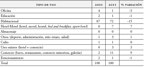 De forma paralela, la naturaleza de los subsidios directos, como los de Rehabilitación Patrimonial de Corfo y del Minvu, también ha contribuido a generar una proliferación de nuevas tipologías comerciales en inmuebles destinados anteriormente a viviendas. El estudio de los cambios en el uso del suelo desde el año 2001 al 2011 (cuadro 4), a través de la elaboración propia de datos aportados por el Servicio de Impuestos Internos y contrastados a través del portal oficial de la ciudad de Valparaíso, así lo evidencian. En un período de diez años, se aprecian cambios significativos en el uso de suelo. Si en 2001, año anterior a la puesta en marcha del Plan Valparaíso, el uso predominante era habitacional, complementado por comercios y algunos inmuebles adaptados a pequeñas oficinas, en el año 2011 la zona había perdido su cariz residencial, pasando a compartir este uso con comercios y pequeños hoteles. Este fenómeno de boutiquización se caracteriza por generar mayores rentabilidades del suelo urbano a través de la reconversión hacia espacios donde predominan comercios especializados, como boutiques de ropa exclusiva, restaurantes con comidas sofisticadas, galerías de arte, tiendas de souvenirs y hotelería (Carrión, 2007). En este sentido, la patrimonialización de Valparaíso ha tenido consecuencias similares a las de otras ciudades latinoamericanas denominadas Patrimonio de la Humanidad por la Unesco. Steel y Klaufus (2010) destacan que en Cusco (Perú) y Cuenca (Ecuador), las transformaciones han tenido también un impacto urbano, materializado en la instalación de bares, discotecas, boutiques y restaurantes en antiguas viviendas, principalmente destinados a la afluencia turística.