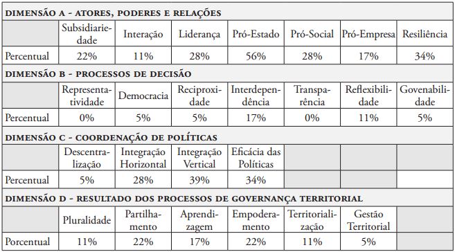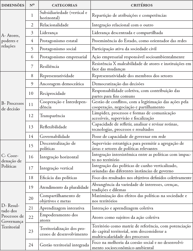 O questionário utilizado na pesquisa foi elaborado tomando por base a concepçãosobre governança ou governança territorial de um conjunto de autores, tendo sido destacados os componentes analíticos considerados princípios fundantes de práticas qualificadas de governança territorial. O quadro 1 sintetiza tais componentes analíticos, na forma de dimensões, categorias conceituais e critérios.