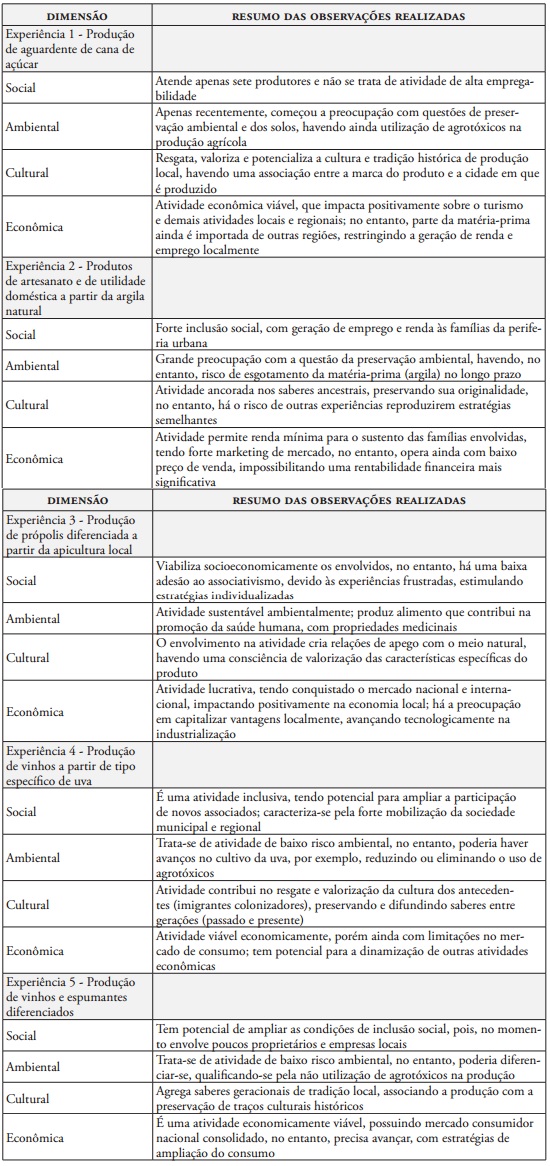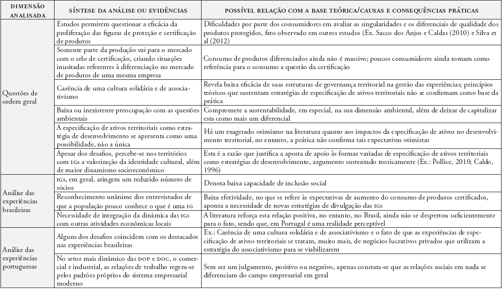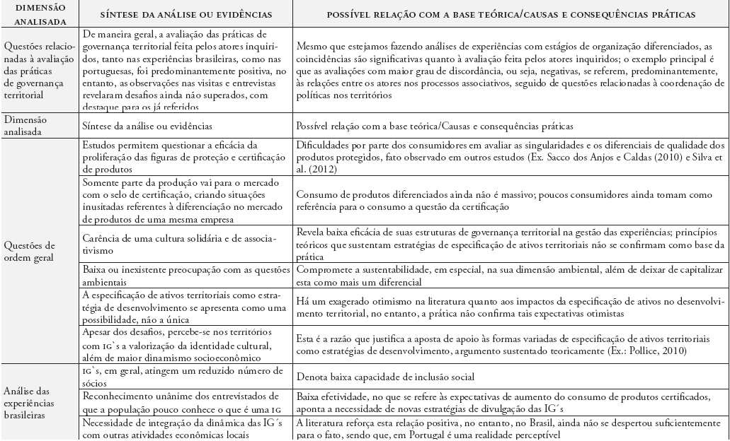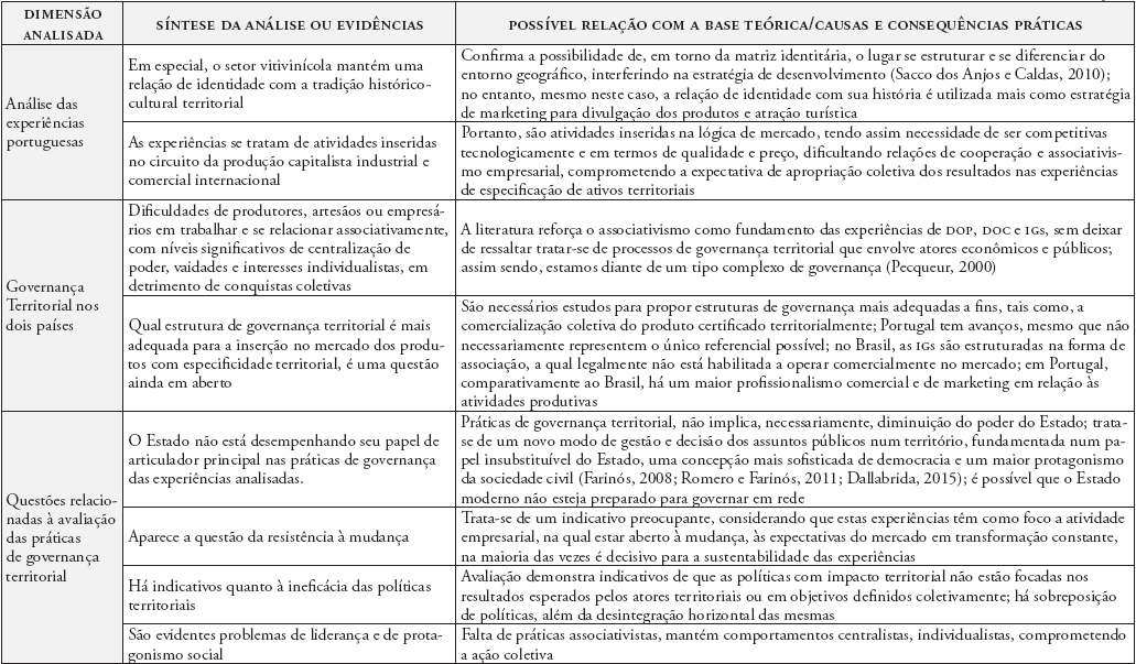 Além da síntese que consta no quadro 5, destacamos questões relacionadas com a estrutura de governança territorial das IGS (Brasil) e DOC/DOP (Portugal). Nosso propósito era avaliar a contribuição efetiva dos sistemas de governança territorial de estratégias baseadas na especificação de ativos territoriais para a sustentabilidade social, econômica e ambiental dos territórios envolvidos. Ou seja, compreender se as estruturas de governança territorial de tais experiências estão ou não apoiadas em mecanismos institucionais adequados.