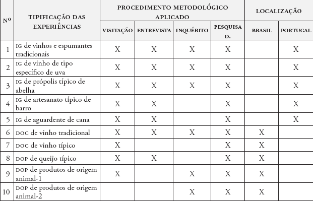 Ao se tratar conjuntamente as experiências de especificação de ativos territoriais no Brasil e Portugal, é indispensável lembrar que há uma diferença expressiva entre a quantidade de produtos e o teor das normas. Assim mesmo a opção em eleger experiências dos dois países, deveu-se à oportunidade da realização de estudos de estudos em Portugal, em 20133.
