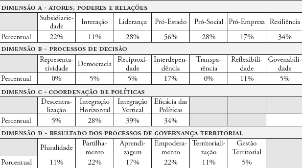 Das dimensões das práticas de governança territorial, a que tem maior incidência de respostas discordantes é a que se refere às relações entre os atores nos processos associativos, seguido da dimensão referente à coordenação das políticas nos territórios. Tal situação tem relação com o que foi comentado a respeito da desintegração das políticas, sejam de origem estatal ou não, além das questões referentes aos problemas de liderança e resistência às mudanças. Coincide com percepções já formadas quando da visita a algumas experiências, ao conversar com atores envolvidos e dirigentes.