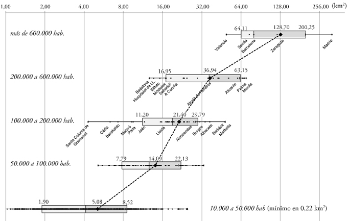 No obstante, sí resulta interesante conocer el rango de valores de la superficie artificial en que se mueve cada uno de los tipos. Así, las ciudades intermedias se sitúan entre los 12,6 Km2 de Badalona y los 70,1 Km2 de Murcia, con una media de 36,9 Km2 de superficies artificiales. Las ciudades medias, de 50.000 a 200.000 habitantes, oscilan entre los 4,3 Km2 de Santa Coloma de Gramanet y los 48,4 Km2 de Badajoz, con una media de 16,2 Km2. Por último, para las pequeñas ciudades de menos de 50.000 habitantes, la media se sitúa en 5,1 Km2, pero con grandes diferencias entre subtipos, pues para ciudades mayores a 30.000 habitantes la media es de 8 Km2 y para las menores es de 4,5 Km2.