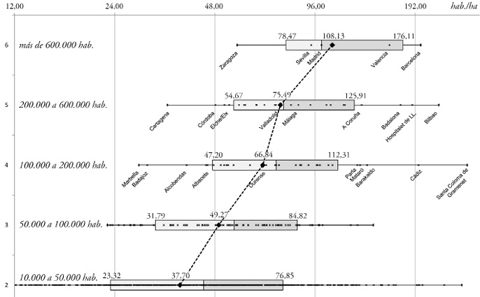 Para el caso de ciudades medias, los valores oscilan entre los 22,81 y los 274,92 hab./ha, y entre los 35,44 y los 96,72 hab./ha en el rango del 70% de los casos, siendo la media de 55,93 hab./ha. Entre las ciudades de más de 100.000 habitantes, los valores por debajo de los 30 hab./ha corresponden a municipios con fuerte presencia de urbanizaciones residenciales de baja densidad, tanto situados en el interior (Toledo, 27,42 hab./ha) como sobre todo costeros (Orihuela o Marbella), generalmente asociadas estas urbanizaciones a campos de golf. Para poblaciones menores a 100.000 habitantes, a las situaciones anteriores se les añade la presencia de grandes áreas de usos industriales. Los casos con densidad de población por encima de los 100 hab./ha se corresponden con términos de áreas metropolitanas (Santa Coloma de Gramanet, 274,92 hab./ha), en los que casi toda su superficie es ocupada por áreas residenciales, al igual que para las pequeñas ciudades y ciudades en que la orografía condiciona el crecimiento (como Cádiz, 196,33 hab./ha).