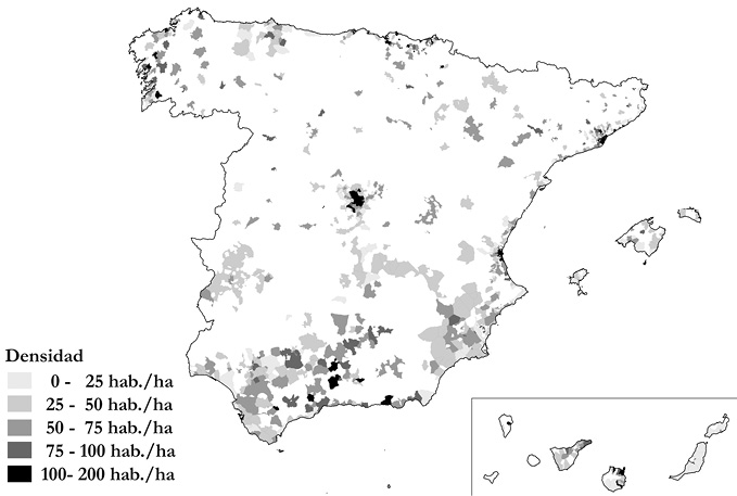 Si los valores mínimos de densidad corresponden a términos con áreas importantes de suelo transformado artificialmente, pero sin uso residencial, los valores máximos se deben a municipios con uso casi exclusivamente residencial, enclavados en áreas urbanas que abarcan varios municipios. Estos son los casos, por ejemplo, de Mislata en Valencia, 264,77 hab./ha, y Pasaia en Guipuzkoa, 234,55 hab./ha.