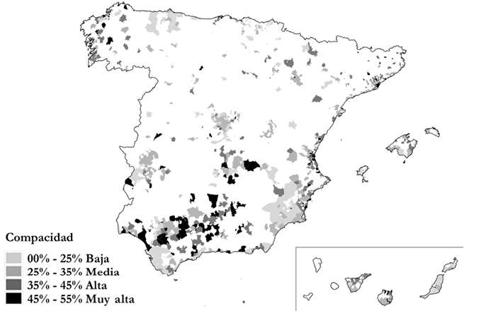 Las ciudades de alta compacidad son más características de todo el valle del Guadalquivir, el litoral valenciano, el área metropolitana de Barcelona y las rías gallegas. En estas mismas áreas, algunas ciudades alcanzan los valores definidos como de muy alta compacidad. Deben señalarse entre estos casos, por su relevancia, los términos de Valencia, Barcelona y otros pertenecientes al núcleo central de estas áreas metropolitanas.