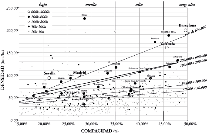 En el conjunto de grandes ciudades, se observa la gran distancia existente entre aquellas de compacidad media o baja (Zaragoza, Madrid y Sevilla) y las muy compactas (Barcelona y Valencia). Es destacable también el fuerte aumento de la densidad que supone el incremento de la compacidad en este tipo de ciudades. La consideración de las distintas áreas metropolitanas en conjunto ofrecería una comparación más precisa, pero aun así se intuye una diferenciación clara del modelo de ciudad compacta mediterránea.