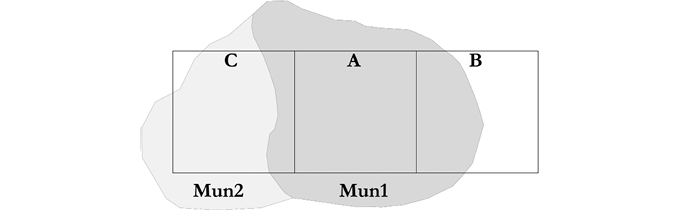 En el cálculo de la densidad de población es necesario realizar algunas operaciones con la rejilla de población geostat 1b de 2011, tanto de agregación como de desagregación, por lo que se genera un factor de error. En primer lugar se aíslan todas las celdas que coinciden con la superficie de cálculo de cada municipio. Hecha esta selección, se presentan tres tipos de situaciones básicas, que pueden observarse en la figura 2: que la celda esté completamente en la superficie artificial de un municipio (celda A), que esté parcialmente sobre dicha superficie (B), y que la celda esté sobre dos o más municipios distintos (C).