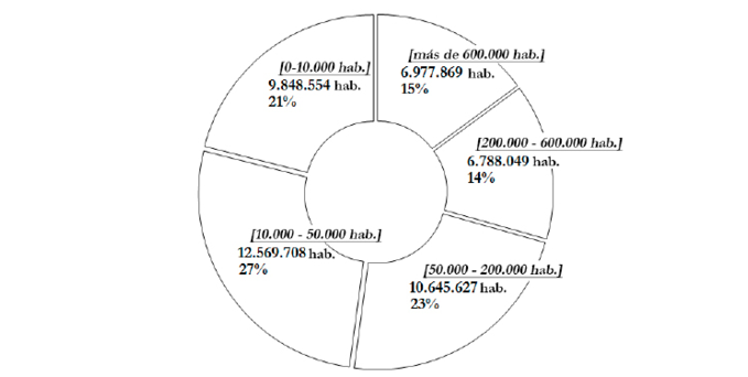 En un último escalón se sitúan las ciudades pequeñas, con una población de entre 10.000 y 50.000 habitantes, que en conjunto acumulan 12.569.708 habitantes, un 27% del total, en 612 municipios. Al ser un grupo mucho más numeroso, sus subgrupos son más diversos.