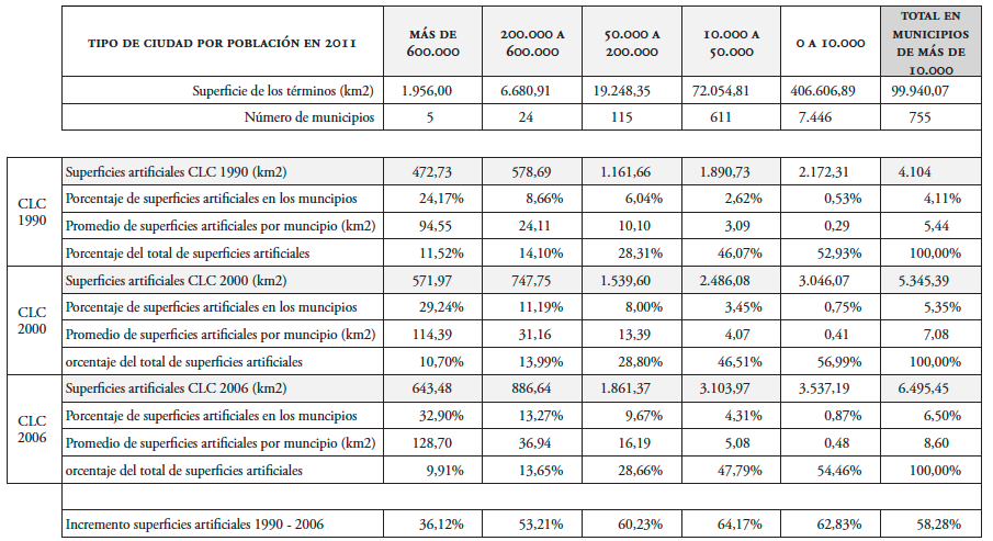 En la evolución de las superficies artificiales en las tres mediciones de clc (1991, 2000 y 2006) se refleja el fuerte crecimiento de las ciudades durante este periodo, tendencia que ha producido una gran transformación de las áreas urbanas en España. En el cuadro 1 se observa un incremento de 58,28% de las superficies artificiales desde el año 1990 al 2006 en los municipios mayores de 10.000 habitantes, pasando de un total de 4.104 Km2 a 6.495 Km2.