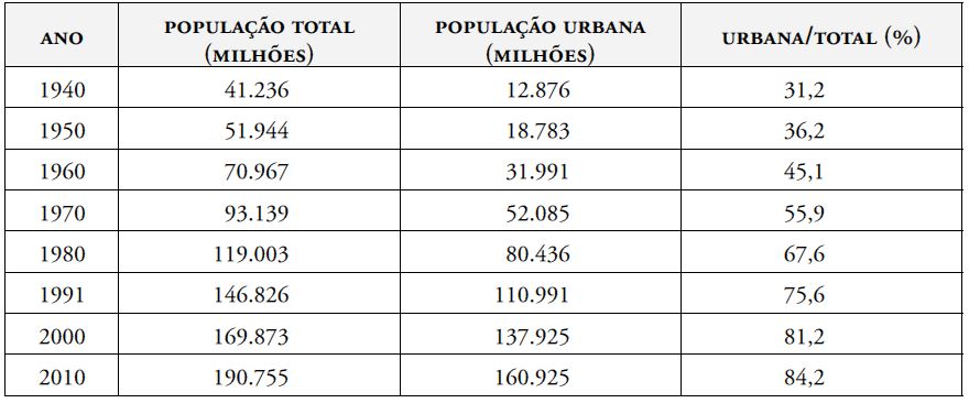 No entanto, é necessário demarcar, os anos 1930 como importantes na expansão e o crescimento industrial do país e as décadas subsequentes com a implantação de infraestrutura, que lançaram as bases do processo de urbanização no Brasil. Os Censos do ibge apontam que em 1950 cerca de 64% da população ainda vivia no campo, passados vinte anos, o Censo de 1970, apontava 56% da população como urbana. O quadro 1 dimensiona essa transição do Brasil rural para uma base econômica e social calcada no urbano.