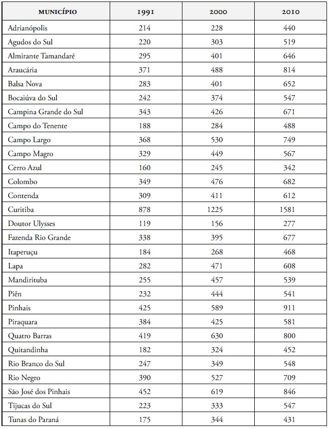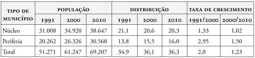 O município nuclear se distancia de todos os demais e a média de seus rendimentos chega a ser 7,4 vezes maior que a do município que se encontra no limite inferior, observe-se que, passados vinte anos (1991-2010) essa proporção se mantém em 5,7 vezes. Em relação ao segundo município com maior média entre 1991 e 2000 a proporção se manteve em torno de 1,9, caindo no ano de 2010 para 1,75.