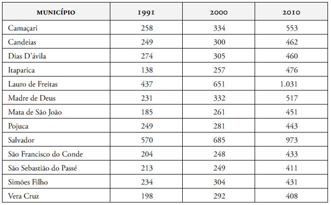Alguns números evidenciam a persistência dessas assimetrias, a exemplo da Região Metropolitana de Salvador, onde o município núcleo possui um pib per capta 4,1 vezes superior a municipalidade que se encontra no limite inferior, o que revela de início a expressividade da economia soteropolitana em detrimento do restante, já que ali se concentra o maior produto interno bruto, bem como de um contingente populacional bem superior ao restante dos demais municípios.