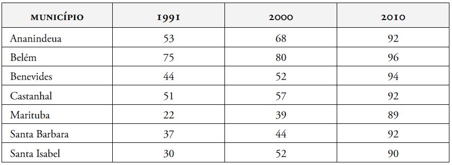 A evolução dos indicadores, que no ano de 2010 colocaram quase todos os municípios da mrg Belém em patamares semelhantes, se deveu muito mais a política de saneamento, do que propriamente a ações voltadas para o desenvolvimento da região na perspectiva mais sistêmica. Assim, os investimentos mesmo quando apresentam bons resultados não decorrem de uma ação coordenada para incluir os indivíduos e não se dão dentro de uma estratégia de tornar essas áreas urbanas competitivas nem atrativas para os investimentos.