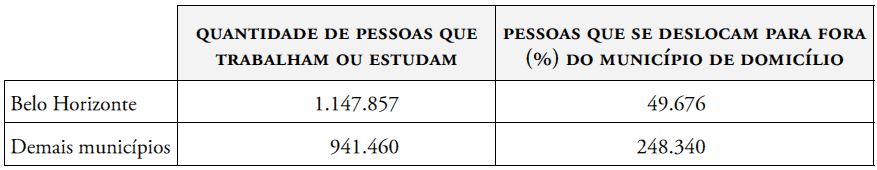 No caso da rm de Belo Horizonte, o quadro 4 mostra o numero de pessoas que dependem de alguma forma do município central, seja para trabalhar, seja para ter acesso a bens e serviços. Logo, o sistema de transporte, em suas múltiplas modalidades, se vê fortemente pressionado. No caso específico, os números não são capazes de demonstrar o número de pessoas que utilizam cada modal, mas podem apontar para um alto percentual de pessoas, que são obrigadas a se deslocar corroborando com os congestionamentos e superlotação dos sistemas de massa.