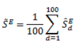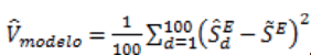 De esta forma, lo que se realiza es implementar simulaciones de Montecarlo para calcular el valor esperado de cada índice de segregación (S), condicional en la regresión estimada en la primera etapa; la varianza generada por el componente idiosincrático del ingreso per cápita de los hogares; y el vector de gradientes que determina la matriz varianza-covarianza. Con cada simulación se obtienen 100 vectores de términos de error de la distribución estimada en la primera etapa. Luego, con cada uno de estos vectores se calcula un valor para S (en la ecuación siguiente) y, finalmente, el valor esperado simulado para S (en la ecuación siguiente) es la media para las 100 réplicas: