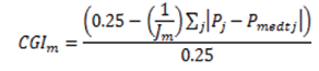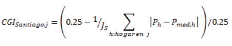 donde Jm es el número de hogares en el área metropolitana m, Pj es el percentil de ingreso de hogares j en la distribución del ingreso del área metropolitana m, y Pmedtjes el percentil de ingreso del hogar que está en la mediana de la distribución del ingreso en el área metropolitana m. Si hubiera integración perfecta en un área metropolitana, cada área geográfica tendría la distribución completa de ingresos y el índice cgi sería igual a 0. En el caso de segregación completa, el área metropolitana tendría solo barrios homogéneos y el índice cgi sería igual a 1.12
