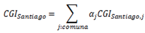 El índice cgi puede descomponerse como un promedio ponderado de la contribución de cada comuna j al índice, donde los ponderadores son simplemente la fracción de la población comunal sobre la población total del Gran Santiago: