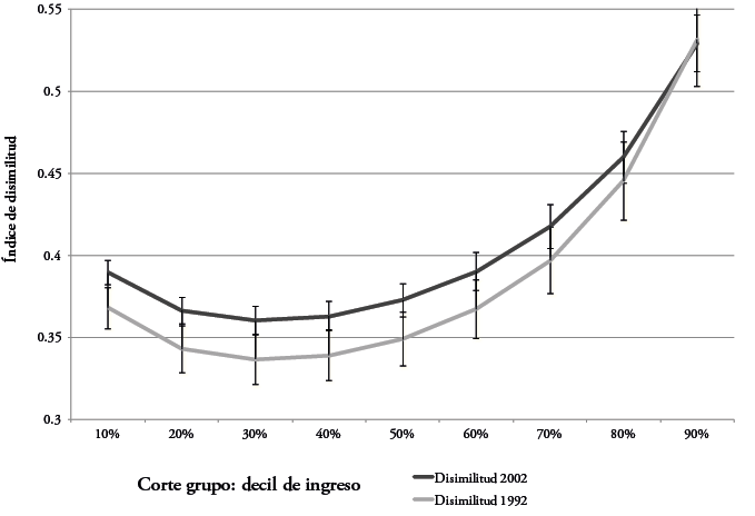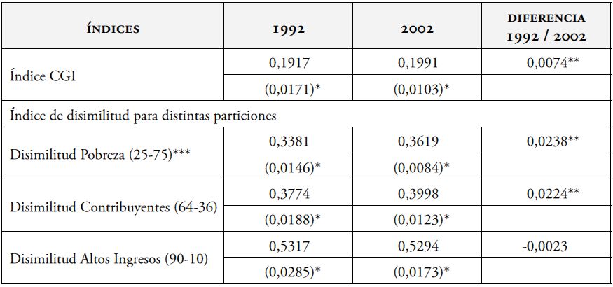 En el cuadro 1 se presentan las estimaciones de los índices de segregación para 1992 y 2002. En el caso del índice de disimilitud, se reportan los índices para los tres grupos mencionados: 25% más pobre, contribuyentes y 10% más rico, con sus respectivos errores estándar.