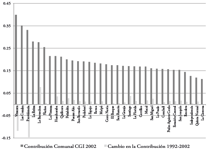 La figura 2 muestra tanto los niveles de la contribución comunal como los cambios entre 1992 y 2002. Se observa una gran heterogeneidad en ambas variables. Las comunas que constituyen el “barrio alto” de la ciudad –Vitacura, Las Condes, Providencia, La Reina, Ñuñoa, y más recientemente Lo Barnechea– son precisamente las que exhiben una mayor contribución específica a la segregación de la ciudad, con una contribución promedio de 0,316 que contrasta con el promedio de 0,172 para el resto de las comunas del Gran Santiago. A su vez, Vitacura, Las Condes, Providencia y La Reina, son las comunas que más reducen su contribución a la segregación de la ciudad en la década analizada, mientras que Lo Barnechea la aumenta. Es decir, parece existir una correlación negativa entre el nivel de la contribución y el cambio en ella.