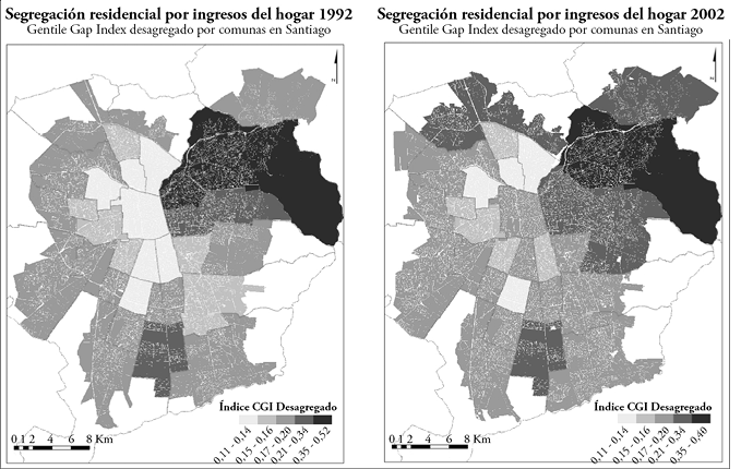 En esta sección se presentan los principales resultados obtenidos en la medición de segregación residencial por ingresos en el Gran Santiago para los años 1992 y 2002. A estos efectos se utiliza el ingreso de cada hogar, el cual es estimado usando las nuevas técnicas para combinar encuestas de hogares con datos del censo detalladas previamente, y se proyectan dos tipos de medidas de segregación.