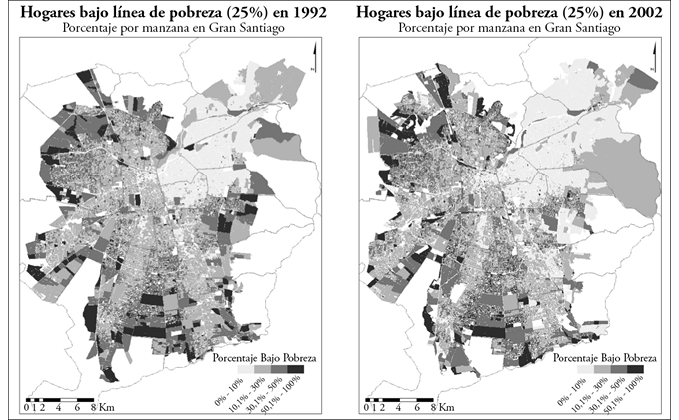 Trabajos previos que usan este índice para medir segregación residencial por estrato socioeconómico, lo han hecho a partir de identificar a los pobres o un grupo vulnerable versus el resto de la población. La segregación residencial de los pobres es sin duda interesante no solo descriptivamente, sino también porque la pobreza es el foco de políticas urbanas y sociales que suelen tener una alta prioridad para los gobiernos. Sin embargo, su medición por estrato es compleja, e incluso inconsistente, si se considera su evolución en el tiempo. En la década de los noventa, Chile experimentó una caída muy significativa de la pobreza absoluta. En la Región Metropolitana, entre 1992 y 2003, la pobreza cayó de 26,2% a 13,1%, es decir, se redujo a la mitad. En consecuencia, esta definición no corresponde a categorías que sean estables en el tiempo. Una alternativa es considerar un porcentaje fijo de la población de menores ingresos, la cual sin duda está entre los grupos más vulnerables de la población. En particular, se puede plantear que el 25% más pobre en Chile durante todo este período –cercano a la tasa promedio nacional de pobreza en la década en cuestión– es un grupo que sin duda podemos asociar a un grado importante de carencias y falta de acceso a oportunidades.