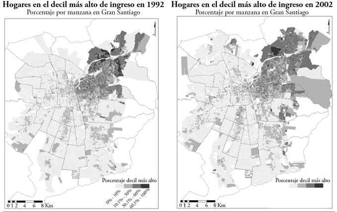 Respecto a las tendencias de localización de altos ingresos, entre 1992 y 2002 la pobreza retrocede y aumenta la presencia del decil más rico en Lo Barnechea y sectores precordilleranos de Las Condes, La Reina y Peñalolén. Es decir, el oriente precordillerano tiende a homogeneizarse y la expansión en esa zona de la ciudad se asocia con una localización de hogares de altos ingresos.20Por su parte, las expansiones de la ciudad en la periferia del nororiente y sur de Santiago son extensiones de pobreza.