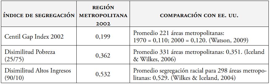 El cuadro 2 recoge una comparación de los niveles de segregación encontrados para Santiago, respecto de mediciones para ciudades norteamericanas. Independientemente de la medida utilizada, la segregación en Santiago es muy superior al promedio de los registros para ciudades norteamericanas usando cgi, y niveles algo mayores en el caso de la disimilitud a partir del grupo de pobreza.